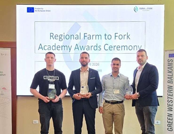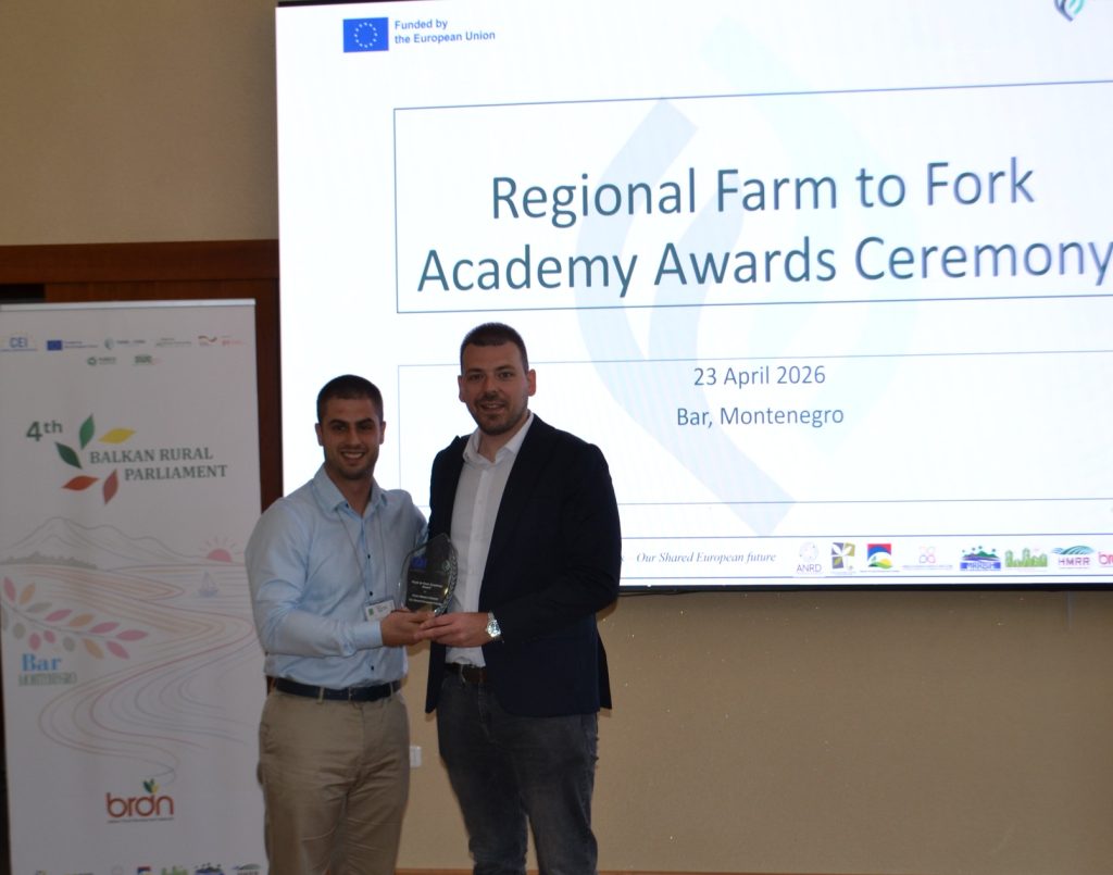 Parlamenti IV Rural Ballkanik, i mbajtur në qytetin bregdetar të Bar nga 21 deri më 24 prill 2026, prezantoi ceremoninë e parë të Çmimeve të “Akademisë nga Ferma në Tryezë” në nivel rajonal. Kjo ceremoni shënoi një moment të rëndësishëm të projektit “Akademia nga Ferma në Tryezë për Ballkanin Perëndimor të Gjelbër- E ardhmja jonë e përbashkët Evropiane”, i financuar nga Bashkimi Evropian dhe zbatohet bashkërisht nga familja e Rrjeteve Kombëtare për Zhvillim Rural në gjashtë vendet e Ballkanit Perëndimor dhe Kroaci, së bashku me platformën e tyre rajonale, Rrjetin Ballkanik për Zhvillim Rural.